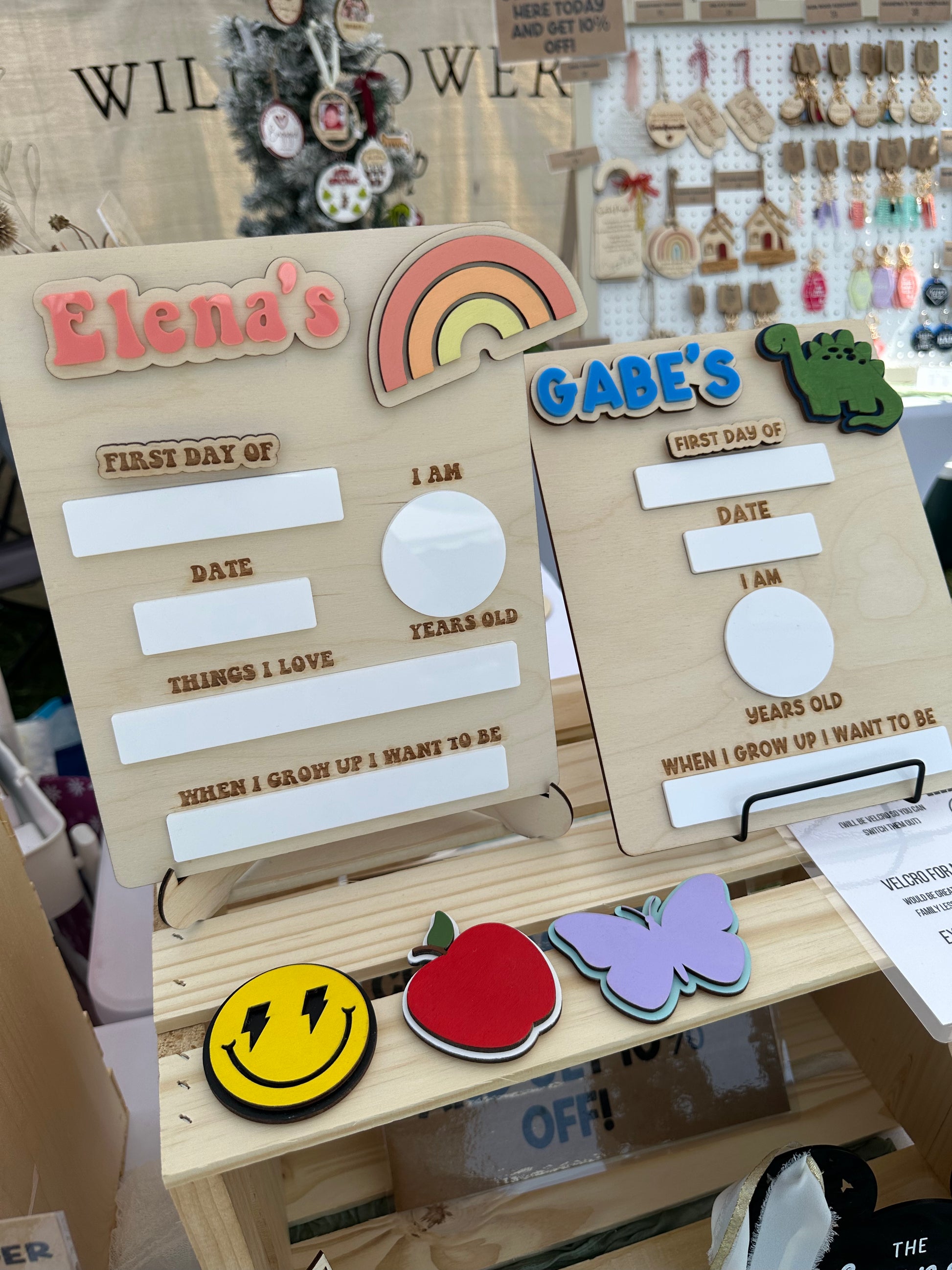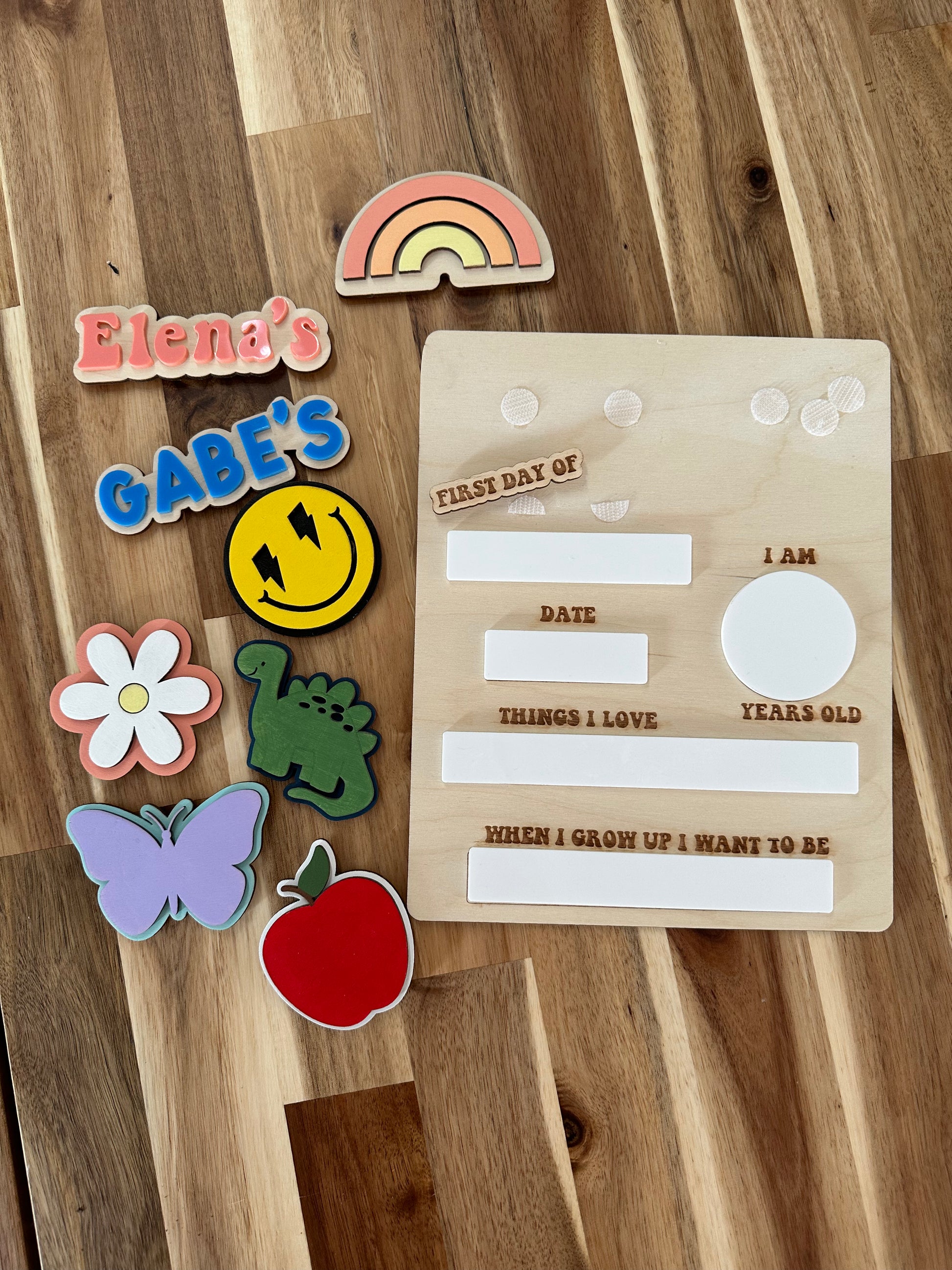 -all boards come with FIRST DAY/LAST DAY velcro piece, one name, & one velcro design!